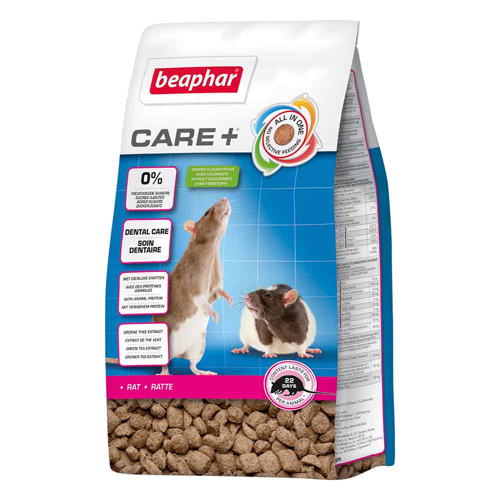 - Ratas que pesan entre 200 y 500 g: Alimentar con 11-22g de Beaphar CARE+ Rata al día.