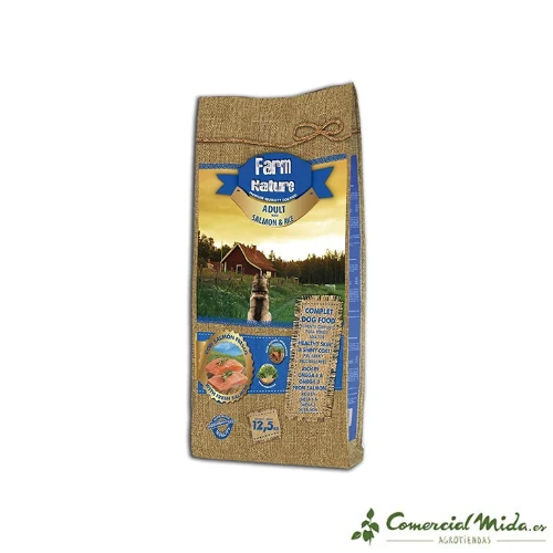 - Saco 12,5 Kg Farm Nature salmón y arroz. EAN 8414606901067.