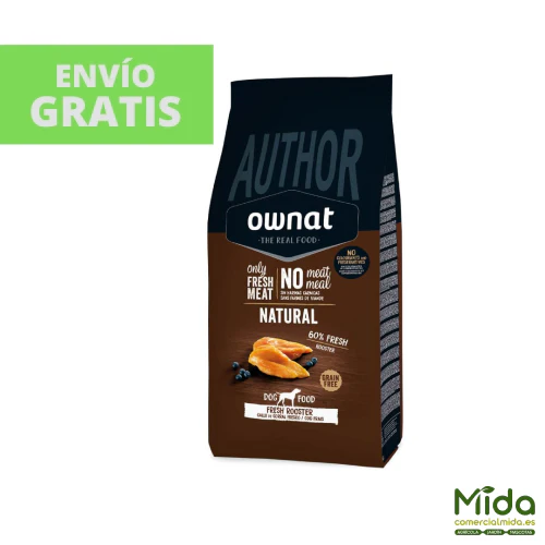 Pienso OWNAT Author Grain Free Fresh Rooster es una fórmula enfocada para perros adultos con actividad normal que busca una dieta Grain Free basada en una alta proporción de carne fresca. El análisis nutricional es consistente con este objetivo: proteína 28% y grasa 18% (alto aporte energético), con perfil de ácidos grasos equilibrado.