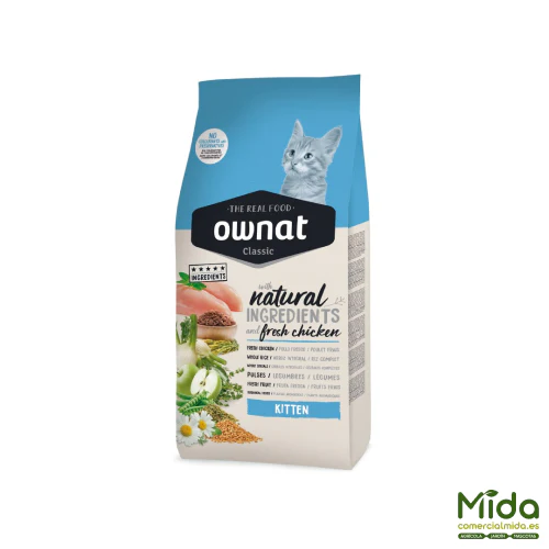 El pienso Cat Classic Kitten de Ownat es un alimento seco de calidad premium diseñado para atender a las necesidades nutricionales de los gatitos de entre 1 y 12 meses. Está formulado con altos niveles calóricos y proteínas esenciales que cubrirán todos los sistemas y funciones para un buen desarrollo y mantenimiento. La carne fresca aporta vitaminas y minerales necesarios para un buen aporte de energía. Posee un extra de fructo y manano oligosacáridos para proteger el sistema digestivo y favorecer el equilibrio intestinal. Su composición está libre de colorantes, aditivos artificiales y colorantes e incorpora proteínas esenciales y proteínas ricas que aseguran un crecimiento fuerte y sano. Aporta un nivel equilibrado de calcio y Vitamina E esenciales para favorecer el desarrollo de la musculatura, la estructura ósea y el sistema inmunitario. Refuerza el sistema digestivo aportándole ingredientes fáciles de digerir y libres de fibras o gluten. Ayuda a reducir los malos olores en las heces y garantiza un proceso de digestión rápido y completo. Su uso está recomendado también para gatas lactantes y gestantes.