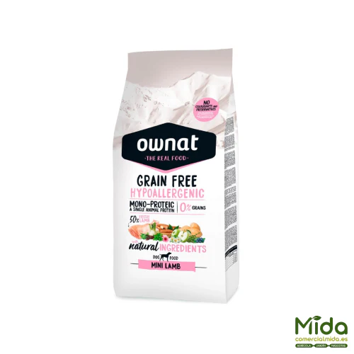 Pienso OWNAT Grain Free Hypo Mini Lamb, el mejor pienso libre de cereales para perros adultos mini (1-10 kg) de Ownat.