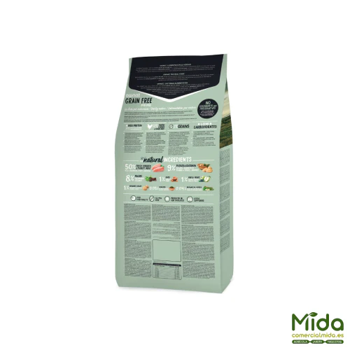Sin cereales (Grain Free): utiliza carbohidratos alternativos como patata y mandioca, de buena digestibilidad.