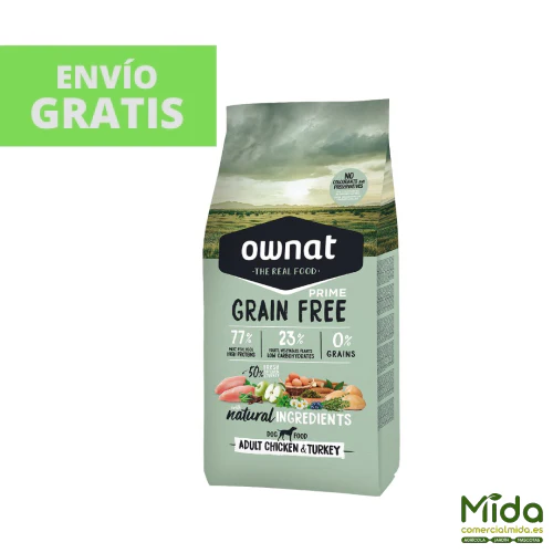 OWNAT Grain Free Prime Adult Chicken & Turkey es un alimento completo para perros adultos, formulado para cubrir las necesidades nutricionales de perros en fase adulta con un nivel de actividad normal. Su receta sin cereales incorpora un 50% de carne fresca de pollo y pavo, aportando proteínas de máxima calidad nutricional, altamente digestibles y muy apetentes. Utiliza fuentes alternativas de carbohidratos como patata y mandioca, junto con ingredientes funcionales como arándanos, algas marinas y hierbas aromáticas. Incluye también glucosamina y condroitina, orientadas al soporte del bienestar articular. Además, está elaborada sin conservantes ni colorantes artificiales, empleando antioxidantes naturales.