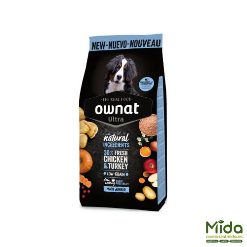 El pienso Ultra Maxi Junior de Ownat es un tipo de alimento seco que facilita y mejora la digestibilidad en cachorros de razas grandes desde el destete hasta el final del periodo de crecimiento. La fórmula está diseñada a base de ingredientes completamente naturales, con altas proporciones de carnes frescas y un contenido limitado de cereales integrales que mejorarán la asimilación de los componentes y facilitando el proceso digestivo. Ofrece un aporte energético elevado y rico en proteínas que mejora el desarrollo de los músculos y los huesos. Los ingredientes son cocidos muy lentamente a baja temperatura para conseguir la máxima calidad nutricional. Incorpora fruta y verdura frescas que actúan como potente antioxidante natural, semillas de lino para el cuidado del pelo y la piel y plantas aromáticas que mejoran el bienestar digestivo. La proporción de calcio y fósforo presenta un equilibrio óptimo para el buen desarrollo de los dientes y la mandíbula.