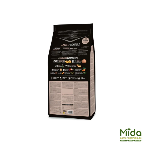 El pienso Ultra Medium Adult de Ownat es un tipo de alimento seco completo y equilibrado que facilita y mejora la digestibilidad en perros adultos de razas medianas de entre 1 y 7 años. La fórmula está diseñada a base de ingredientes completamente naturales, con altas proporciones de carnes frescas y un contenido limitado de cereales integrales que mejorarán la asimilación de los componentes y facilitando el proceso digestivo, regulando el tránsito. Ofrece un aporte energético elevado y rico en proteínas que mejora el desarrollo de los músculos y los huesos. Los ingredientes son cocidos muy lentamente a baja temperatura para conseguir la máxima calidad nutricional. Incorpora fruta y verdura frescas que actúan como potente antioxidante natural, semillas de lino para el cuidado del pelo y la piel y algas marinas para incorporar minerales orgánicos naturales. Las legumbres incorporan proteínas y vitaminas vegetales que mantendrán una salud de hierro de las mascotas.
