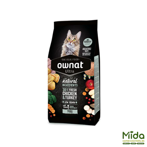 OWNAT Ultra Young es un alimento completo y equilibrado para gatos hasta 6 años y también apto durante la etapa de cría. Elaborado con 30% de carne fresca de pollo y pavo, destaca por su excelente sabor y alta palatabilidad. Está diseñado para cubrir las necesidades nutricionales de un gato adulto con un nivel de actividad normal, sin importar raza o tamaño. Su fórmula Low Grain utiliza bajos porcentajes de cereales integrales, incluyendo arroz integral de elevada digestibilidad. Además, su proceso Soft Cooking al vapor busca preservar la calidad nutricional original de los ingredientes.