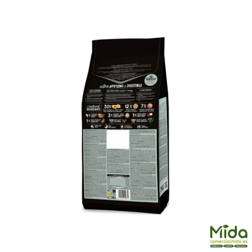 Pollo fresco* (15% mín. antes de la cocción), pavo fresco* (15% mín. antes de la cocción), trigo* (12%), pollo deshidratado (10%), grasa avícola (preservada con antioxidantes naturales), hidrolizado de salmón (8%), arroz* (7%), proteína de trigo, raíces de mandioca* (4%), cerdo deshidratado (3%), proteína de maíz, verduras y frutas frescas antes de la cocción (manzana* 1%, zanahoria* 0,5%, brócoli* 0,5%), levadura de cerveza* (2%), salmón deshidratado (2%), proteína hidrolizada de pollo, lignocelulosa, aceite de salmón (preservado con antioxidantes naturales), pulpa de remolacha, sal gema*, alfalfa deshidratada*, raíces de achicoria (FOS), productos de levaduras (MOS), algas marinas deshidratadas (500 mg/kg), glucosamina (500 mg/kg), condroitín sulfato (100 mg/kg), yucca schidigera, arándanos* (100 mg/kg), té verde* (80 mg/kg), equinácea* (80 mg/kg), flor de manzanilla* (80 mg/kg), hinojo* (80 mg/kg). *Ingredientes naturales.