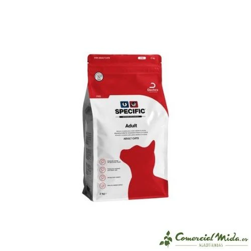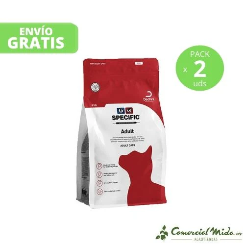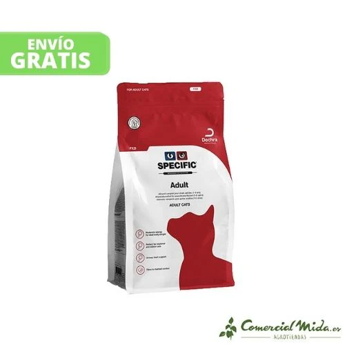 Adult FXD de Specific es un pienso para gatos adultos que tengan menos de 8 años, proporciona una dieta completa y equilibrada formada por ingredientes de alta calidad y digestibilidad que se encargan de satisfacer las necesidades nutricionales de los felinos adultos. Gracias a su contenido energético moderado, el gato se mantendrá en un peso ideal. El consumo de este alimento servirá para prevenir la formación de cristales y cálculos de estruvita, ya que contiene Magnesio y Fósforo en bajas dosis. Contiene un alto nivel de fibra que promueve la expulsión del pelo a través de las heces, minimizando las bolas de pelo y favoreciendo su tracto gastrointestinal. El EPA y DHA mantienen la piel y el pelo del minino en condiciones óptimas.