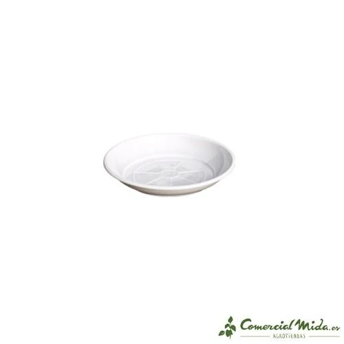 - Plato para maceta hecha en plástico blanco resistente y duro.