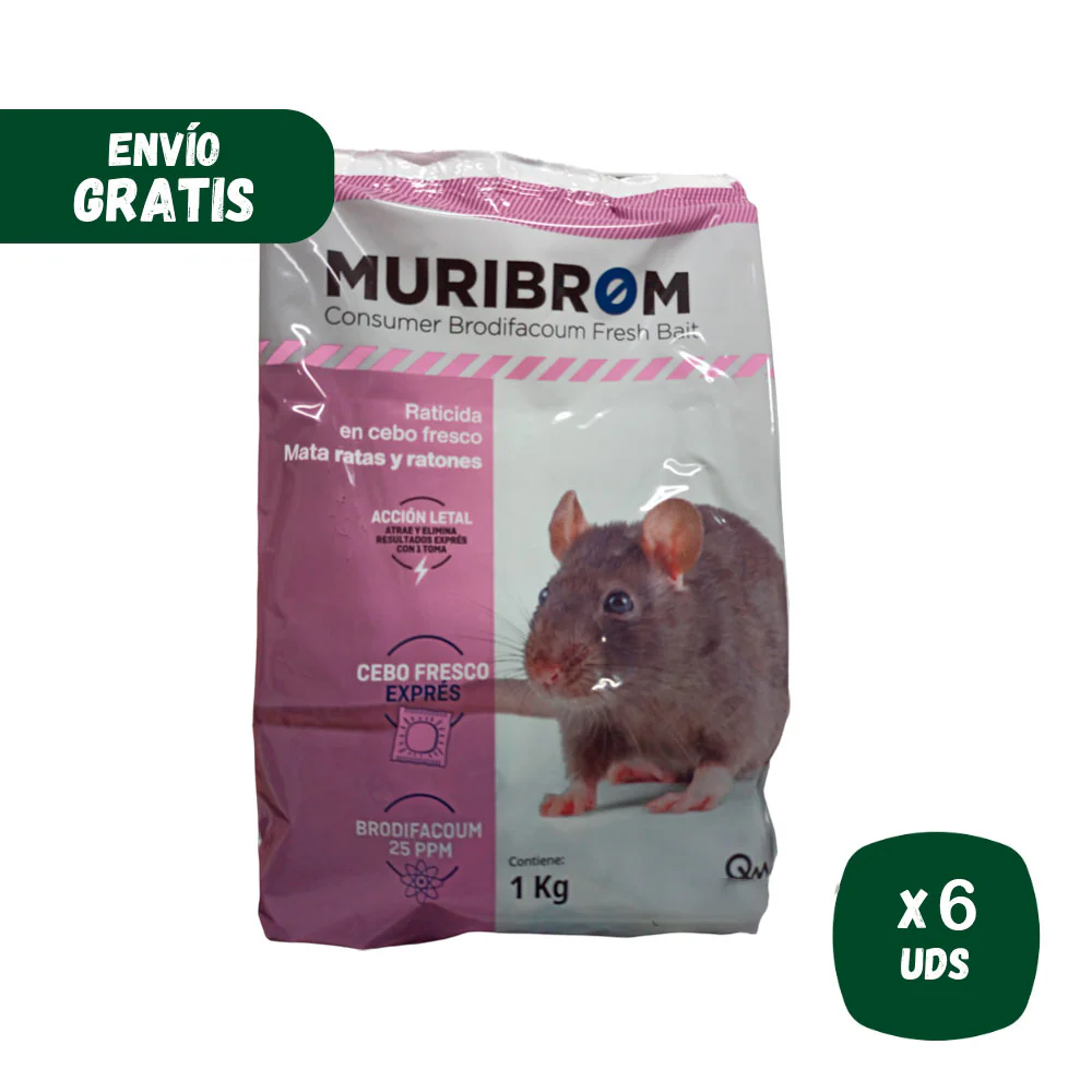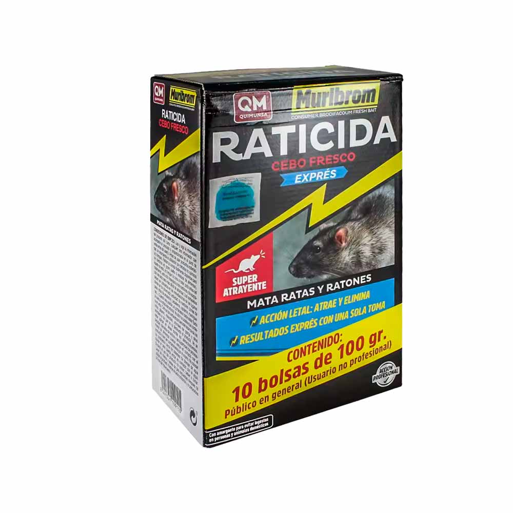 Muribrom Cebo Fresco EXPRÉS es un veneno altamente efectivo y seguro para eliminar ratas y ratones en tu casa o lugar dónde sea necesario controlar una plaga de roedores. Este fantástico rodenticida permite el control de roedores en el hogar, zonas de paso, almacenes, naves, garajes, trasteros, etc. Cualquier localización dónde haya una rata o ratón es necesaria la aplicación de un raticida. Por ello, este Muribrom Cebo Fresco Exprés, formulado con Brodifacoum está pensado para eliminar roedores de forma fulminante, una fantástica noticia para los usuarios de raticidas pero no tanto para ratas de alcantarilla o pardas y ratones comunes. Limpia de roedores viviendas y los alrededores de los edificaciones de forma efectiva, fácil y rápida. Un cebo fresco de que atraerá a los roedores y los matará con solo una toma. Su excelente sabor y poder de atracción hará que las ratas y ratones lo ingieran sin saber lo qué le deparará el destino.