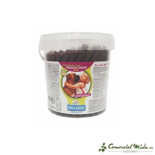 Las barritas de buey de Delidog son un tentempié indicado para su administración a perros. Esta chuchería es perfecta para mantener en buen estado la higiene bucodental del perro, fundamental para que este goce de buena salud. Sirven como premio después de un buen entrenamiento, también se pueden ofrecer para entretener al animal y evitar su sufrimiento si se va a quedar solo o se presenta una situación de estrés para el animal, o también se puede servir como aperitivo para impedir que el animal pase hambre entre las comidas. Morder este masticable supondrá un beneficio en su salud, ya que elimina el sarro y la placa bacteriana limpiando los dientes y evitando que se produzcan diferentes enfermedades en la boca del animal. También ayuda a reforzar la mandíbula. Es un producto 100% natural.