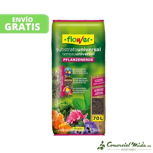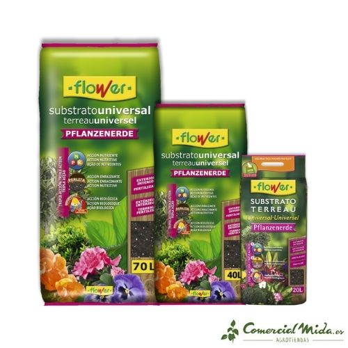 El substrato universal Flower Pflanzenerde es el resultado de la mezcla de diferentes turbas y compost vegetal. Su uso es ideal para aplicarse sobre todo tipo de plantas, de interior y exterior. Favorece un correcto crecimiento y desarrollo, aportando todos los nutrientes y elementos esenciales necesarios para un mantenimiento completo de las plantas. Produce un efecto triple: nutre de forma equilibrada con la ayuda del abono NPK, enraíza gracias al Actirrel de su fórmula, que favorece una mejor asimilación por parte de las raíces y tiene acción biológica, gracias a la composición orgánica y de bacterias naturales (OrganBac). La composición de este sustrato contiene perlita, bolas de pequeño tamaño que garantizan un buen efecto de aireación del substrato que mejora el desarrollo de raíces, tallos, hojas y flores.