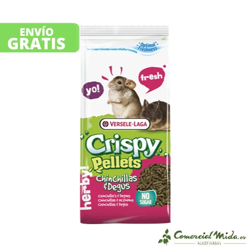 El alimento Crispy Pellets de Versele Laga es ideal para chinchillas, degús y otros pequeños roedores. Es una comida muy rica en fibra y hierbas, lo que ayuda a que los sistemas intestinal y digestivo de estos animales funcione a la perfección. Además, al ser una alimento compacto sin granos se evita el comportamiento alimentario selectivo.